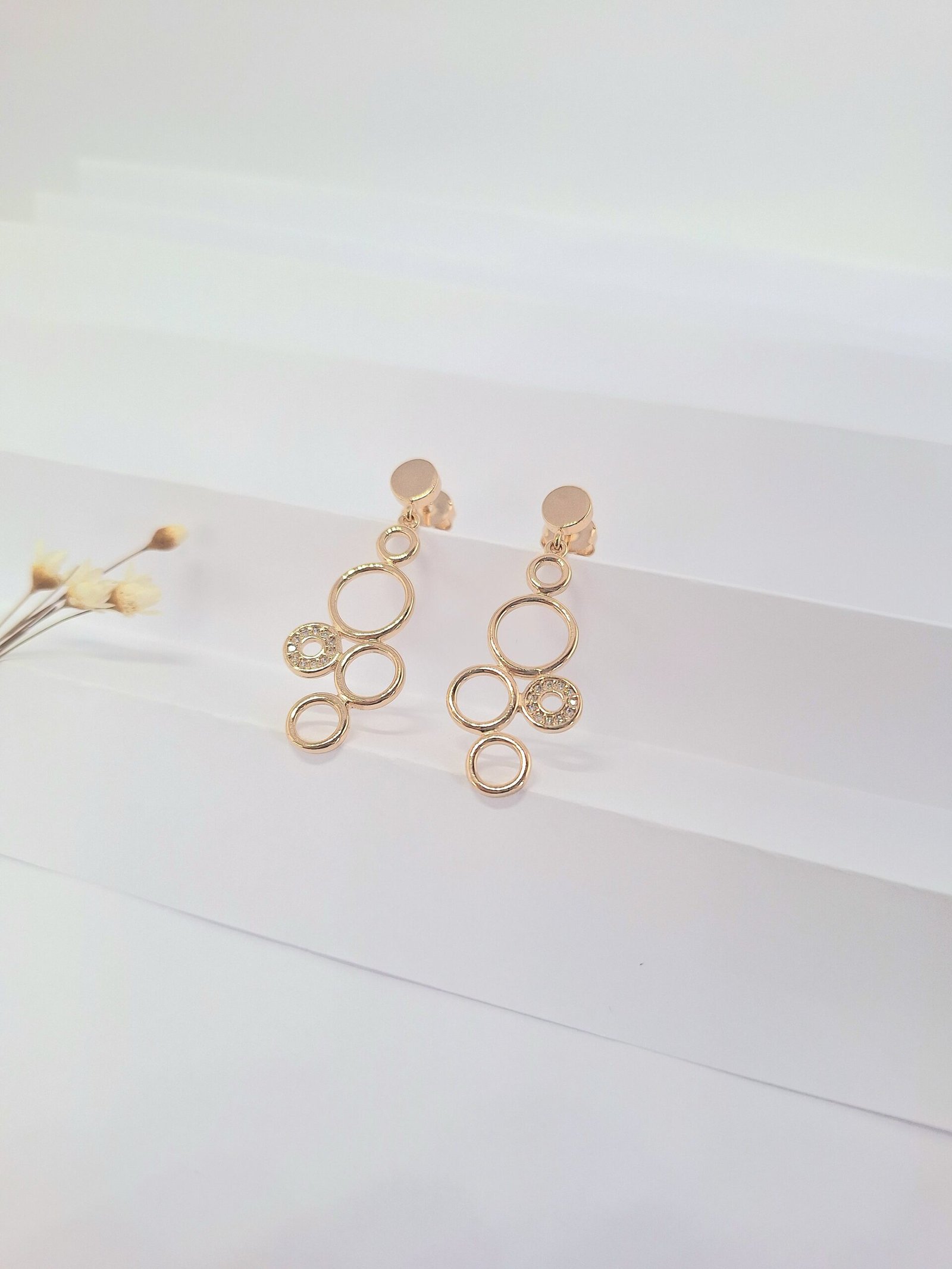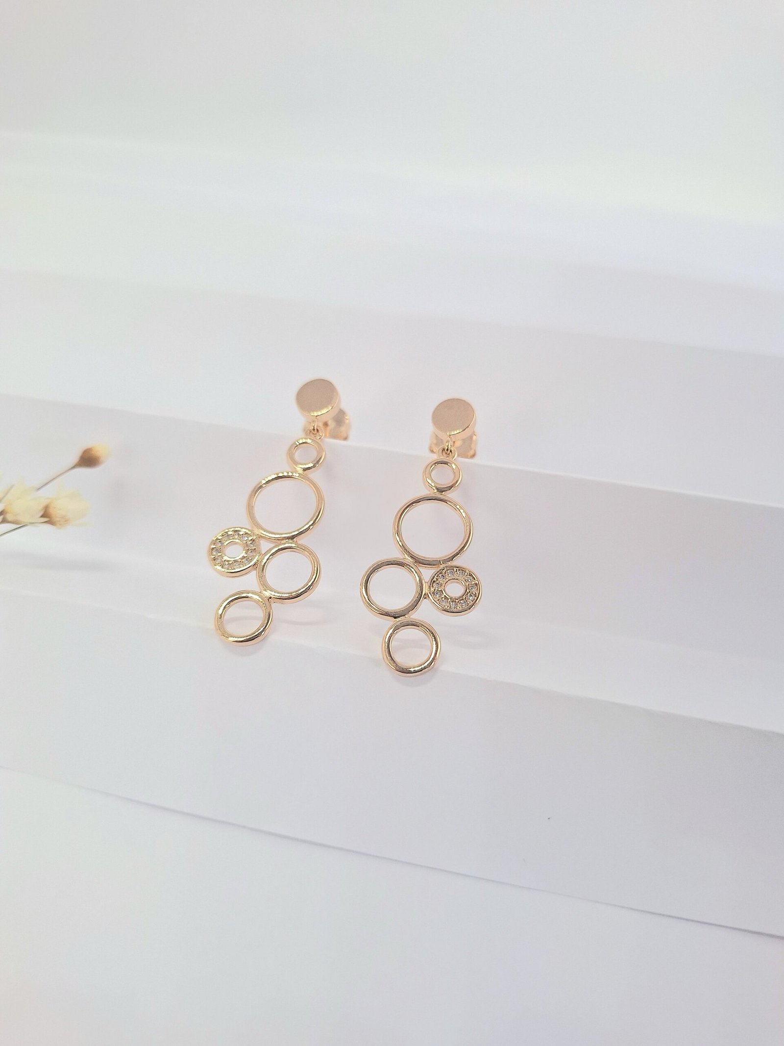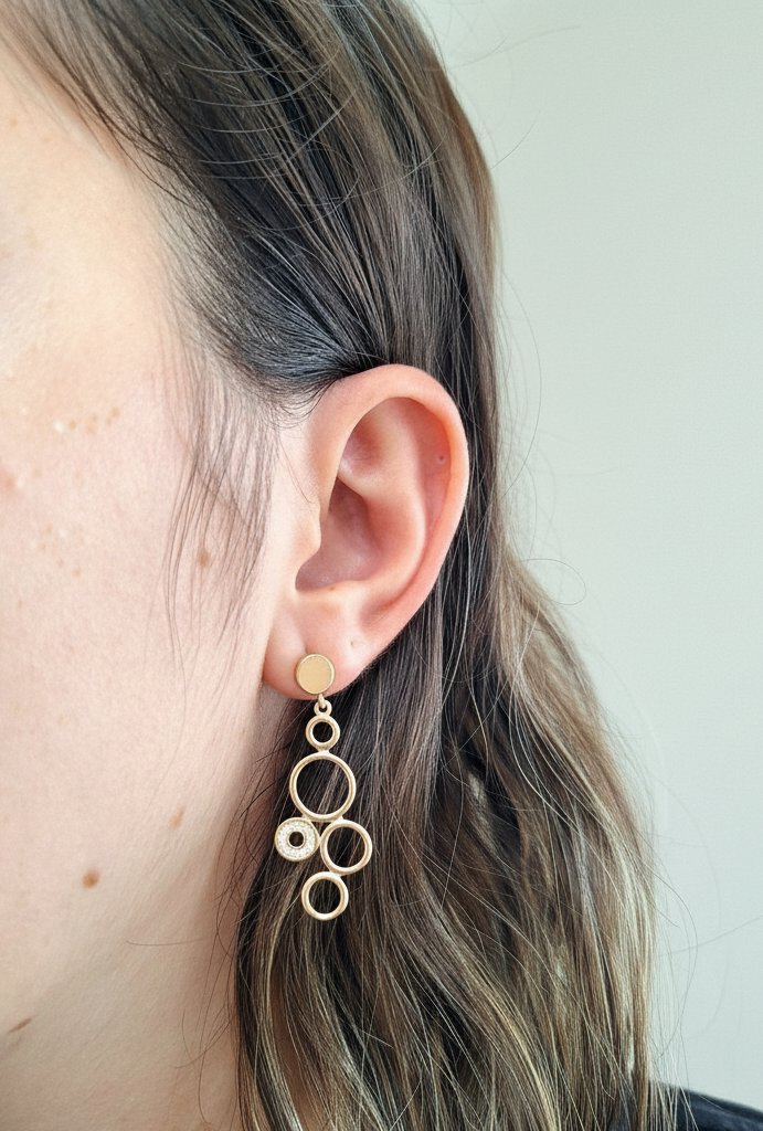 O brinco é composto por delicados círculos interligados, um dos círculos possui zircônias cravejadas, dando destaque à peça com brilho adicional. Sua versatilidade permite que seja usado tanto em eventos formais quanto em momentos casuais, elevando qualquer look.